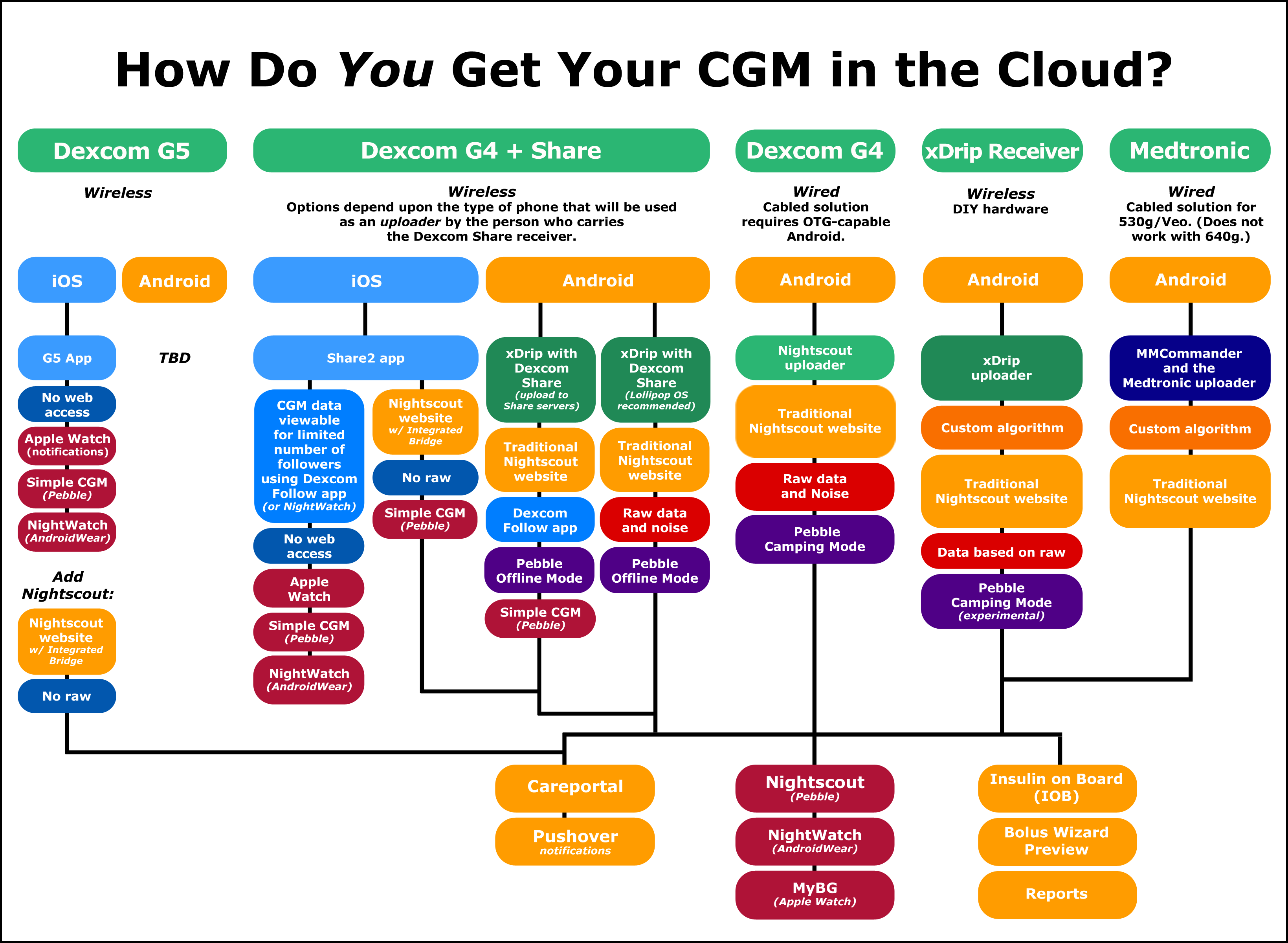 CGM-in-the-Cloud – is a term for any CGM which can be connected to a web site to allow for remote monitoring of someone’s glucose levels. It’s pretty big in USA, not so much over in Europe. A big player in this is Nightscout (see below).